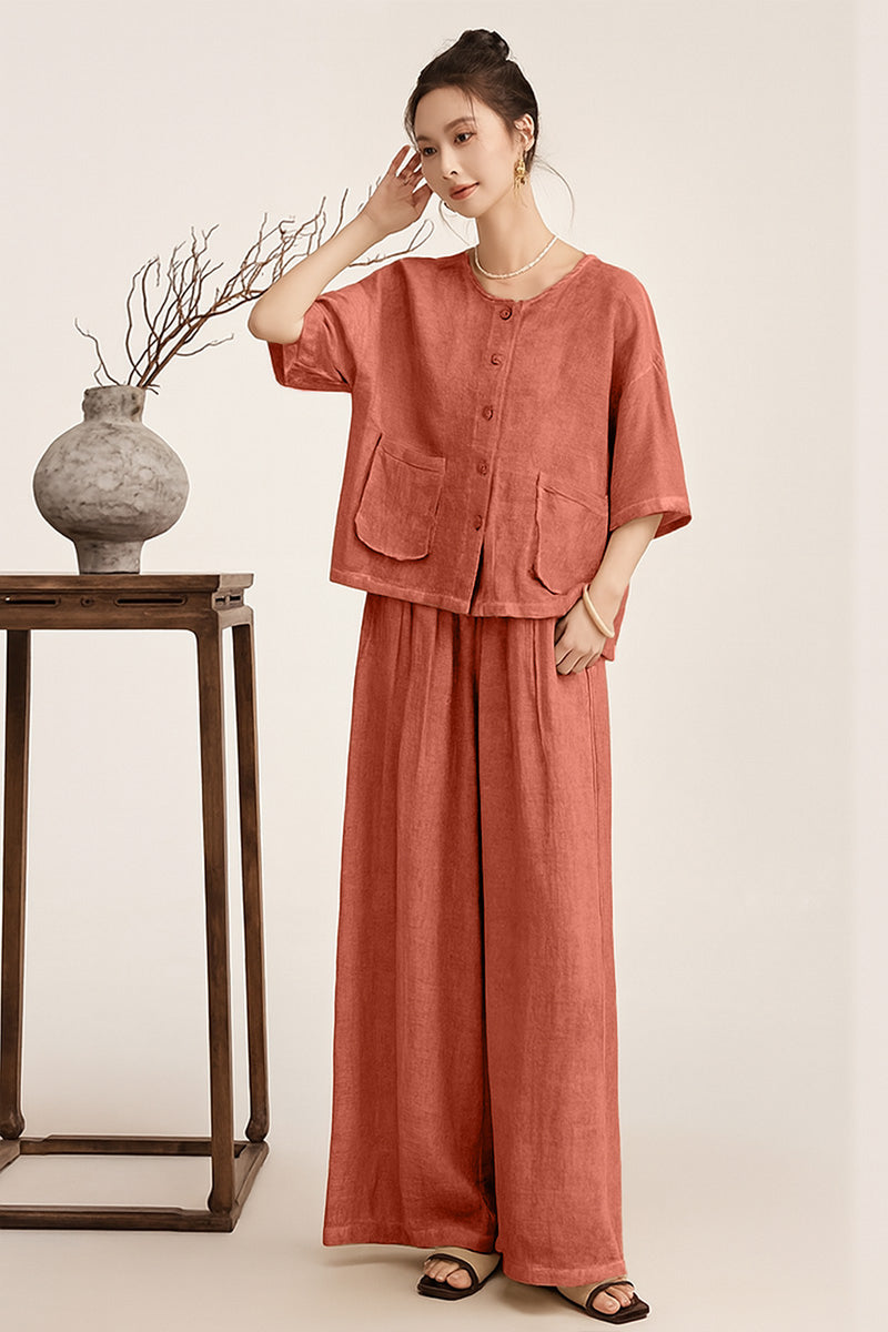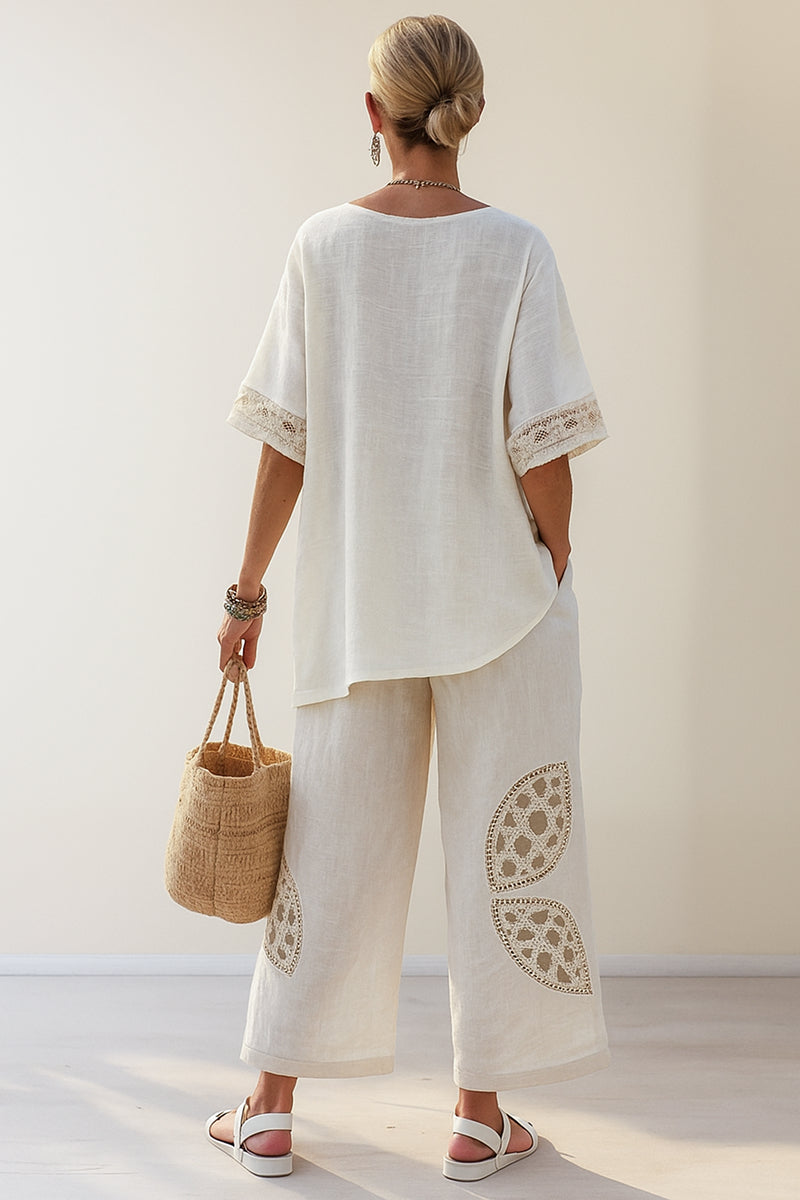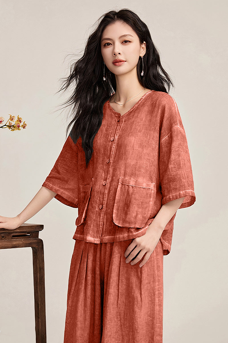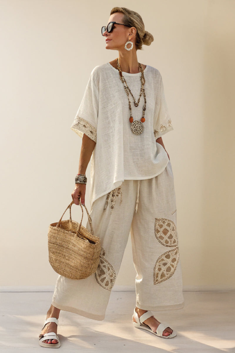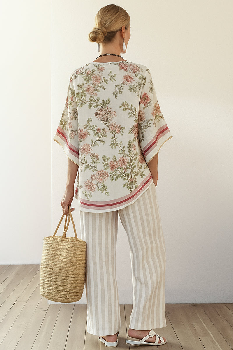 Linen and Cotton Loose Floral Short Sleeves Two-Piece Set